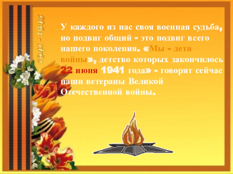 это подвиг всего нашего поколения. «Мы - дети войны», детство которых закончилось 22 июня 1941 года» - говорят сейчас наши ветераны Великой Отечественной войны.
