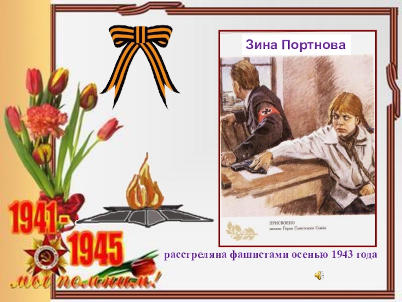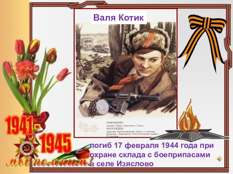 Слайд 42погиб в мае 1944 года в бою с фашистами близ села