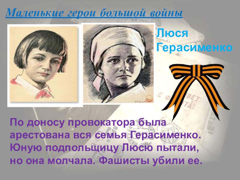 Герасименко. Юную подпольщицу Люсю пытали, но она молчала. Фашисты убили ее.