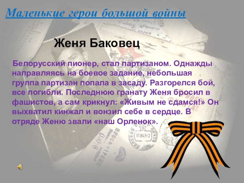 на боевое задание, небольшая группа партизан попала в засаду. Разгорелся бой, все погибли. Последнюю гранату Женя бросил в фашистов, а сам крикнул: «Живым не сдамся!» Он выхватил кинжал и вонзил себе в сердце. В отряде Женю звали «наш Орленок».