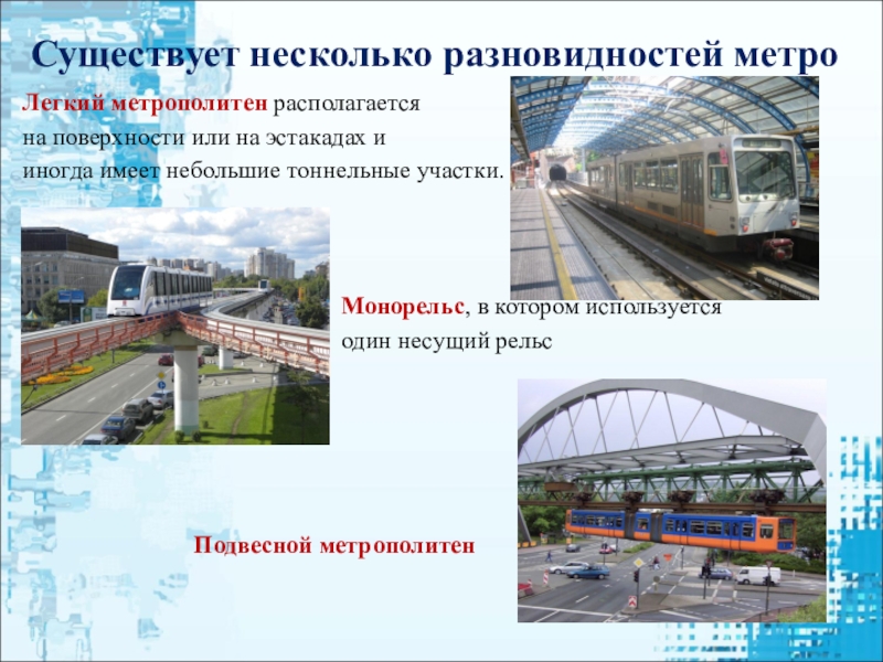 Первая подземная железная дорога была построена в Лондоне в 1863 году компанией «MetropolitanRailway» , через 70 лет метро запустили в Москве. Сейчас метро построено во всех крупных городах мира. Некоторые станции метро очень красивы и оформлены как произведения искусства.