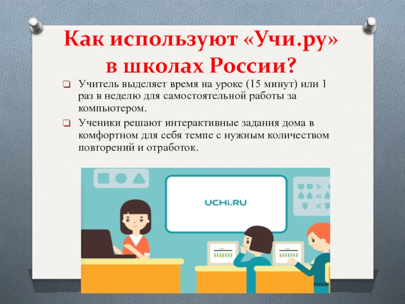 Учитель выделяет время на уроке (15 минут) или 1 раз в неделю для самостоятельной работы за компьютером.