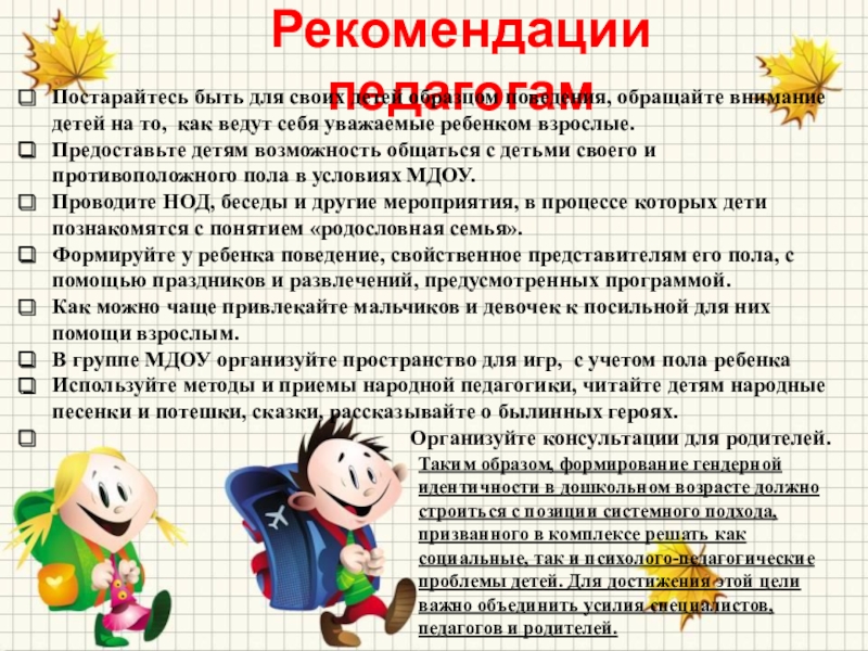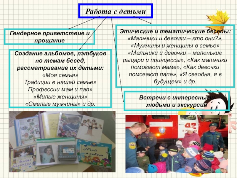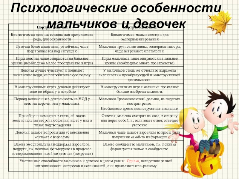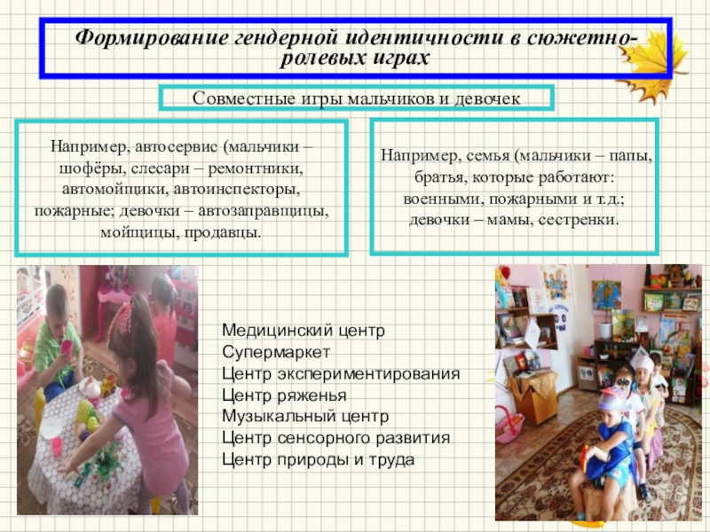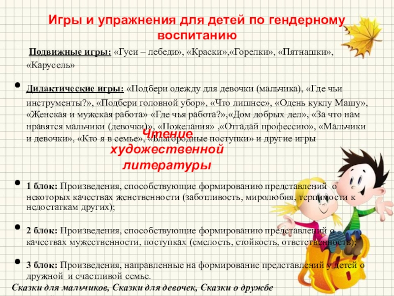 «Подбери одежду для девочки (мальчика), «Где чьи инструменты?», «Подбери головной убор», «Что лишнее», «Одень куклу Машу», «Женская и мужская работа» «Где чья работа?»,«Дом добрых дел», «За что нам нравятся мальчики (девочки)», «Пожелания» ,«Отгадай профессию», «Мальчики и девочки», «Кто я в семье», «Благородные поступки» и другие игры