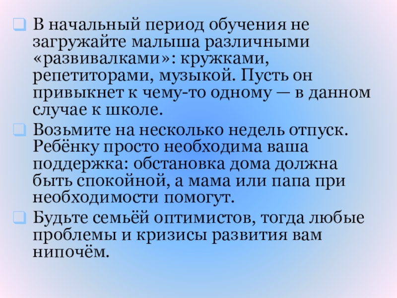 Слайд 37В начальный период обучения не загружайте малыша различными «развивалками»: кружками, репетиторами,