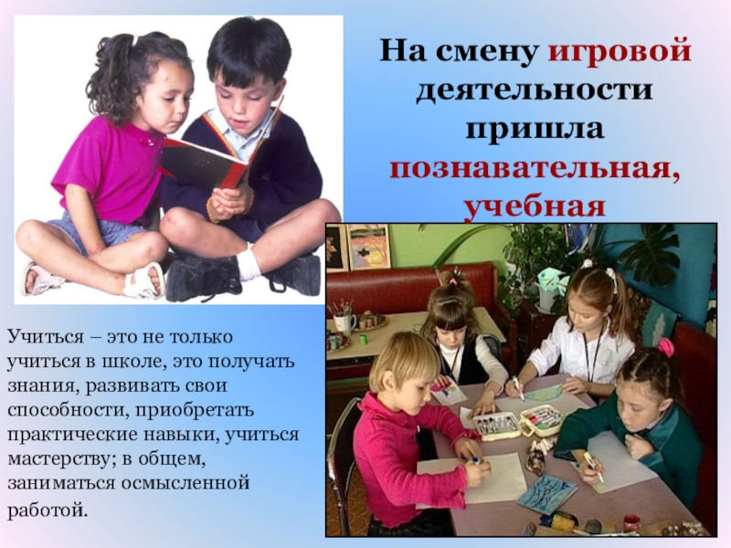 Слайд 27На смену игровой деятельности пришла познавательная, учебная