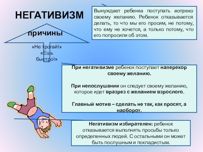 При негативизме ребенок поступает наперекор своему желанию.