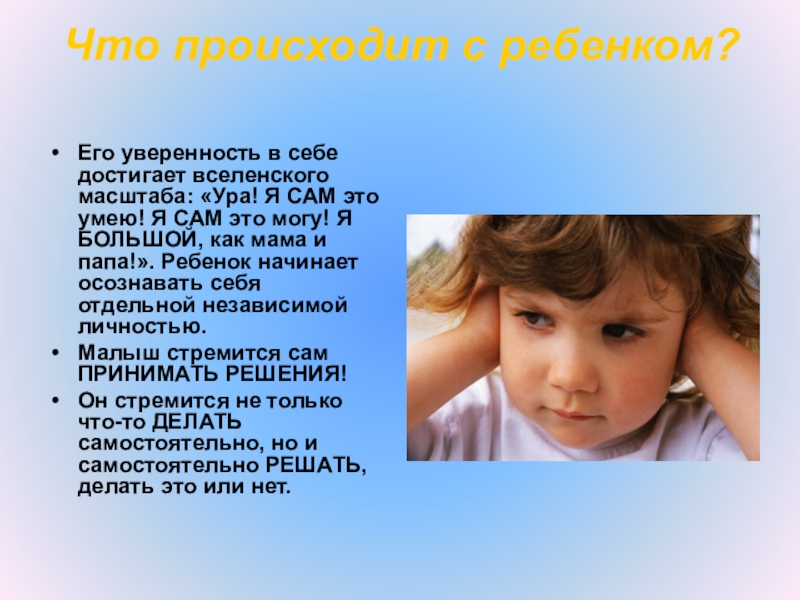Я САМ это умею! Я САМ это могу! Я БОЛЬШОЙ, как мама и папа!». Ребенок начинает осознавать себя отдельной независимой личностью.