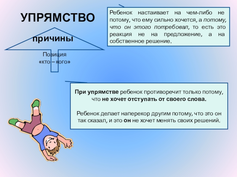 При упрямстве ребенок противоречит только потому, что не хочет отступать от своего слова.