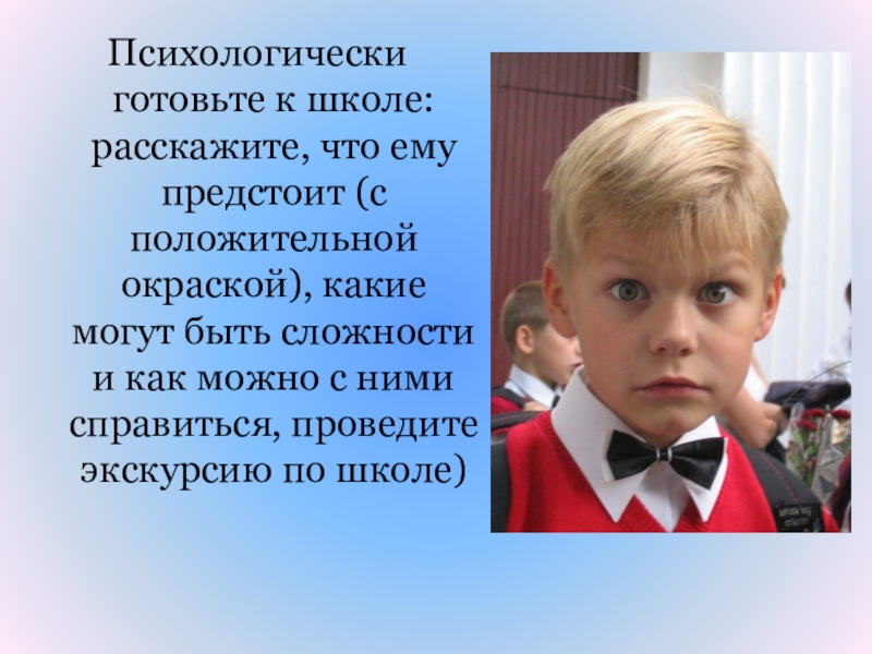 Слайд 45Психологически готовьте к школе: расскажите, что ему предстоит (с положительной окраской),