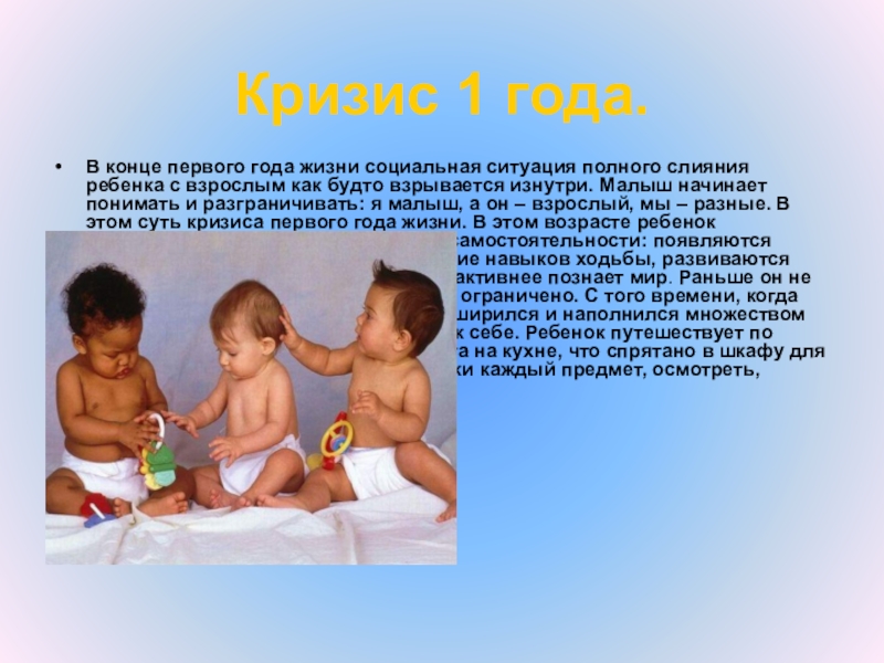 ребенка с взрослым как будто взрывается изнутри. Малыш начинает понимать и разграничивать: я малыш, а он – взрослый, мы – разные. В этом суть кризиса первого года жизни. В этом возрасте ребенок приобретает определенную степень самостоятельности: появляются первые слова, происходит становление навыков ходьбы, развиваются действия с предметами. Ребенок все активнее познает мир. Раньше он не умел ходить, его передвижение было ограничено. С того времени, когда малыш научился ходить, его мир расширился и наполнился множеством вещей, которые “требуют” внимания к себе. Ребенок путешествует по квартире и изучает, как устроена плита на кухне, что спрятано в шкафу для обуви, также он стремится взять в руки каждый предмет, осмотреть, покрутить, попробовать “на зуб .