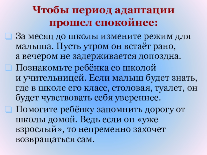 Слайд 36Чтобы период адаптации прошел спокойнее: