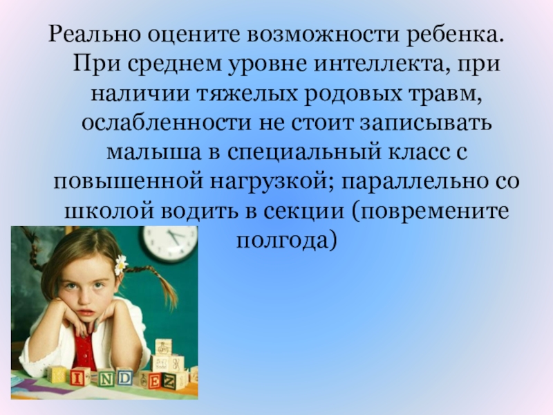 Слайд 46Реально оцените возможности ребенка. При среднем уровне интеллекта, при наличии тяжелых