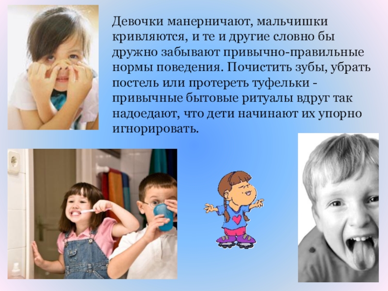 забывают привычно-правильные нормы поведения. Почистить зубы, убрать постель или протереть туфельки - привычные бытовые ритуалы вдруг так надоедают, что дети начинают их упорно игнорировать.