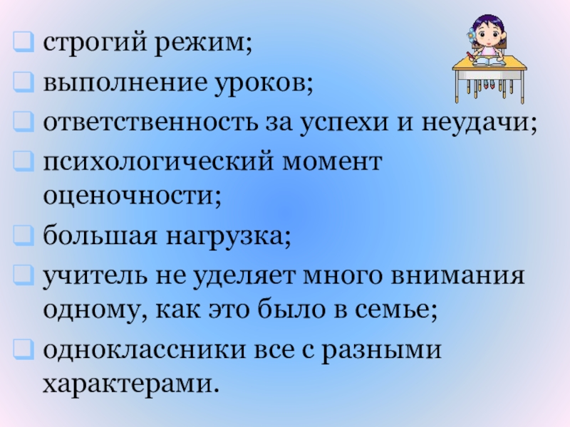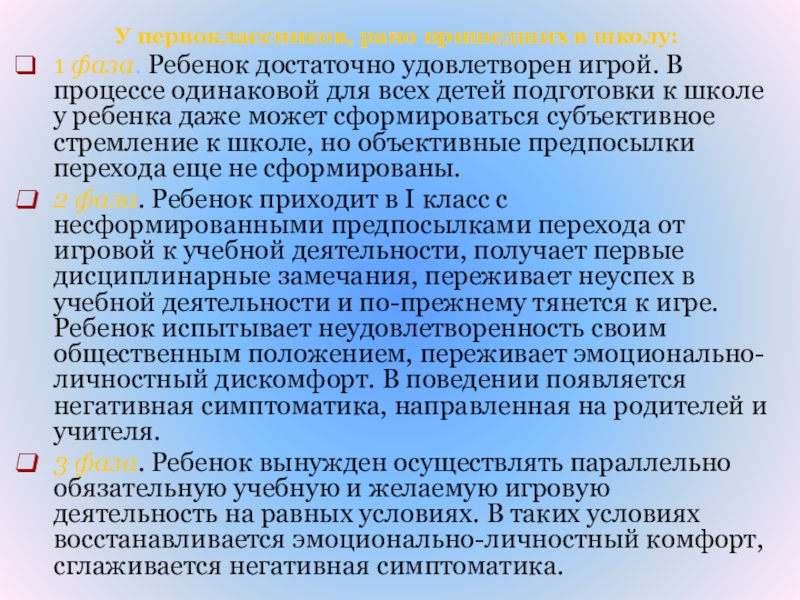 2 фаза. Ребенок приходит в I класс с несформированными предпосылками перехода от игровой к учебной деятельности, получает первые дисциплинарные замечания, переживает неуспех в учебной деятельности и по-прежнему тянется к игре. Ребенок испытывает неудовлетворенность своим общественным положением, переживает эмоционально-личностный дискомфорт. В поведении появляется негативная симптоматика, направленная на родителей и учителя.