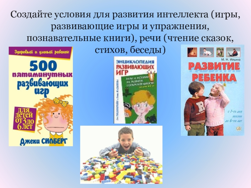 Слайд 41Создайте условия для развития интеллекта (игры, развивающие игры и упражнения, познавательные
