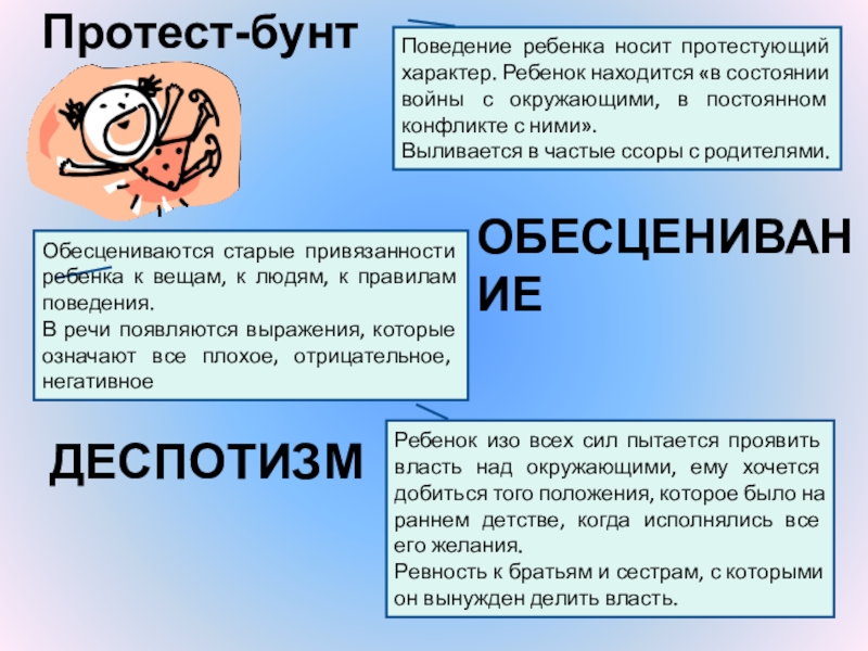 Поведение ребенка носит протестующий характер. Ребенок находится «в состоянии войны с