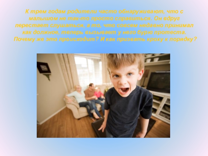 Слайд 9К трем годам родители часто обнаруживают, что с малышом не так-то