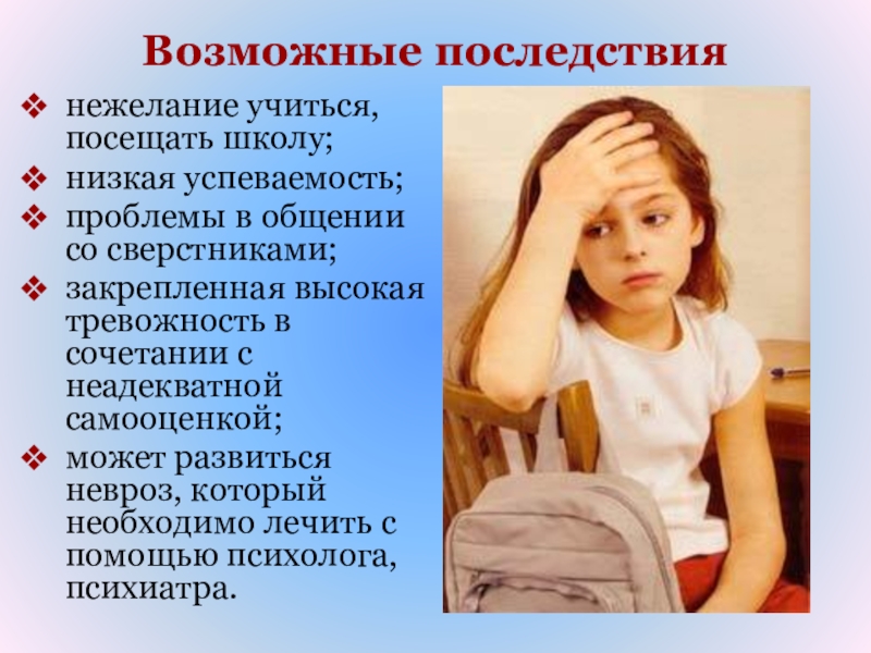 может развиться невроз, который необходимо лечить с помощью психолога, психиатра.