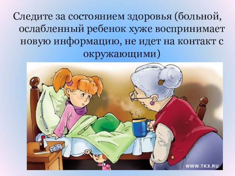 Слайд 44Следите за состоянием здоровья (больной, ослабленный ребенок хуже воспринимает новую информацию,