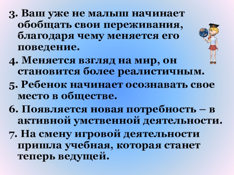 7. На смену игровой деятельности пришла учебная, которая станет теперь ведущей.