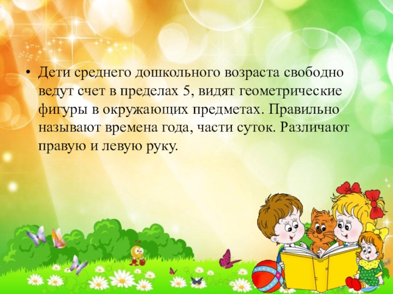 Слайд 19Дети среднего дошкольного возраста свободно ведут счет в пределах 5, видят
