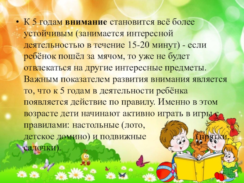 в течение 15-20 минут) - если ребёнок пошёл за мячом, то уже не будет отвлекаться на другие интересные предметы. Важным показателем развития внимания является то, что к 5 годам в деятельности ребёнка появляется действие по правилу. Именно в этом возрасте дети начинают активно играть в игры с правилами: настольные (лото, детское домино) и подвижные (прятки, салочки).