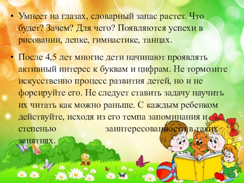 Слайд 5Умнеет на глазах, словарный запас растет. Что будет? Зачем? Для чего?