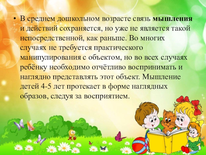 не является такой непосредственной, как раньше. Во многих случаях не требуется практического манипулирования с объектом, но во всех случаях ребёнку необходимо отчётливо воспринимать и наглядно представлять этот объект. Мышление детей 4-5 лет протекает в форме наглядных образов, следуя за восприятием.