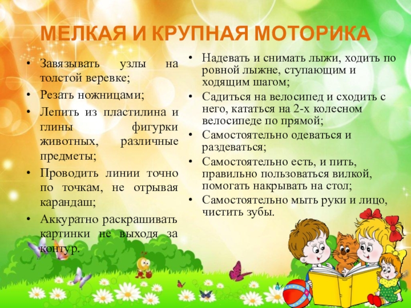 Садиться на велосипед и сходить с него, кататься на 2-х колесном велосипеде по прямой;