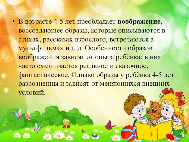 Слайд 18В возрасте 4-5 лет преобладает воображение, воссоздающее образы, которые описываются в