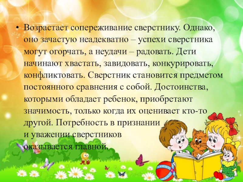 Слайд 8Возрастает сопереживание сверстнику. Однако, оно зачастую неадекватно – успехи сверстника могут