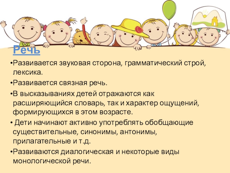 Дети начинают активно употреблять обобщающие существительные, синонимы, антонимы, прилагательные и т.д.