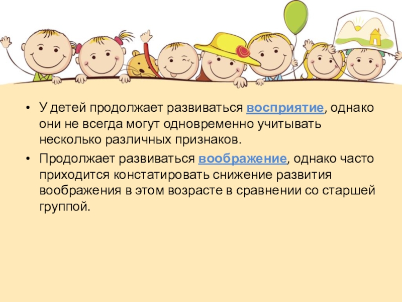 Слайд 7У детей продолжает развиваться восприятие, однако они не всегда могут одновременно