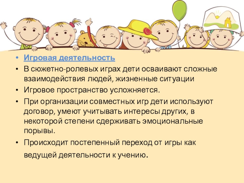 При организации совместных игр дети используют договор, умеют учитывать интересы других, в некоторой степени сдерживать эмоциональные порывы.