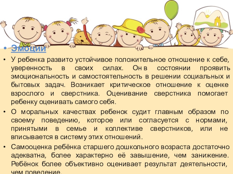 Самооценка ребёнка старшего дошкольного возраста достаточно адекватна, более характерно её завышение, чем занижение. Ребёнок более объективно оценивает результат деятельности, чем поведение.