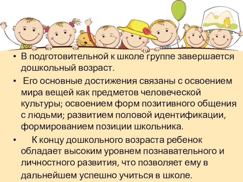 К концу дошкольного возраста ребенок обладает высоким уровнем познавательного и личностного развития, что позволяет ему в дальнейшем успешно учиться в школе.
