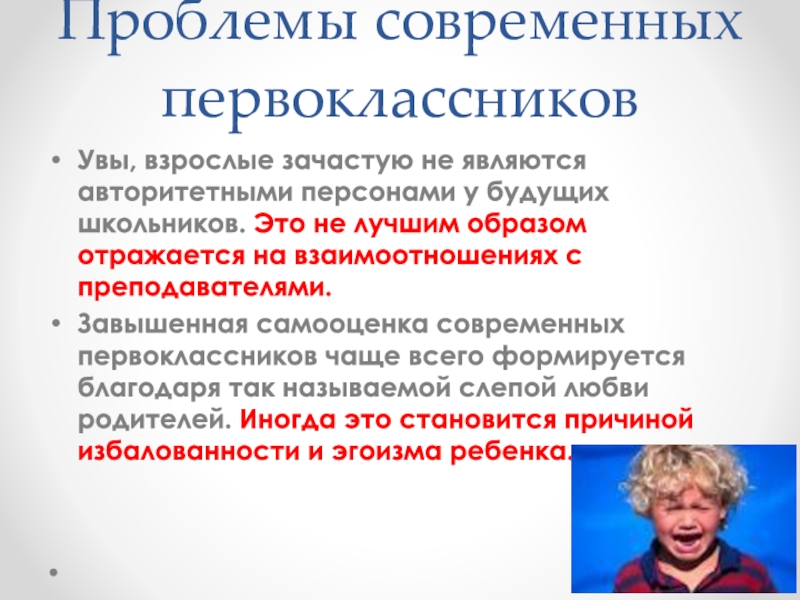 Завышенная самооценка современных первоклассников чаще всего формируется благодаря так называемой слепой любви родителей. Иногда это становится причиной избалованности и эгоизма ребенка.