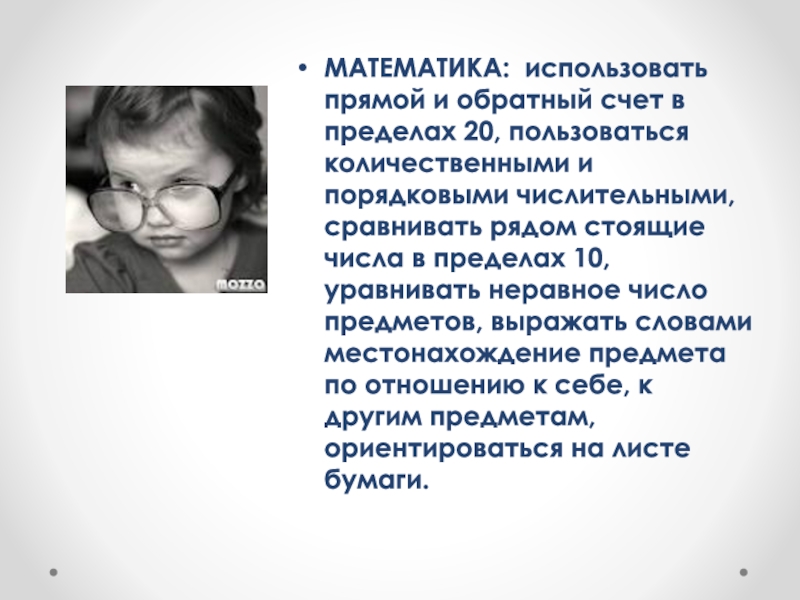 Слайд 6МАТЕМАТИКА: использовать прямой и обратный счет в пределах 20, пользоваться количественными