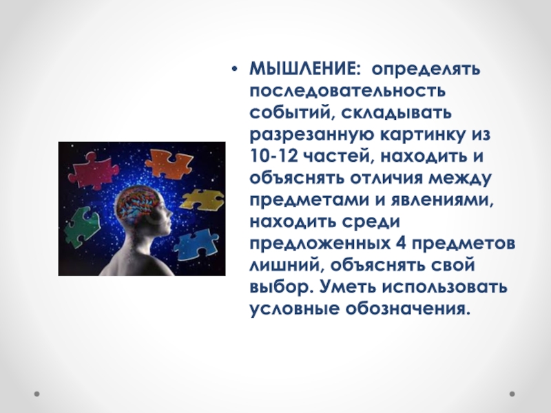 Слайд 5МЫШЛЕНИЕ: определять последовательность событий, складывать разрезанную картинку из 10-12 частей, находить