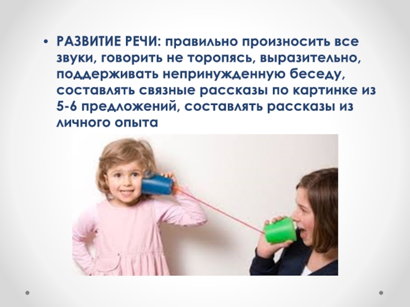 Слайд 7РАЗВИТИЕ РЕЧИ: правильно произносить все звуки, говорить не торопясь, выразительно, поддерживать