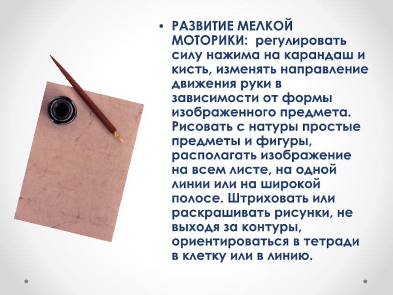 Слайд 8РАЗВИТИЕ МЕЛКОЙ МОТОРИКИ: регулировать силу нажима на карандаш и кисть, изменять