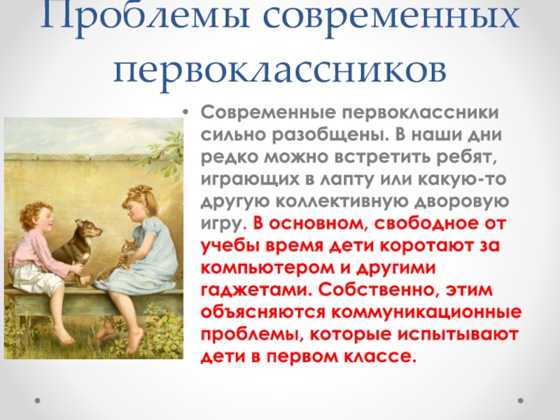 встретить ребят, играющих в лапту или какую-то другую коллективную дворовую игру. В основном, свободное от учебы время дети коротают за компьютером и другими гаджетами. Собственно, этим объясняются коммуникационные проблемы, которые испытывают дети в первом классе.