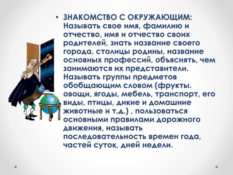 Слайд 9ЗНАКОМСТВО С ОКРУЖАЮЩИМ: Называть свое имя, фамилию и отчество, имя и