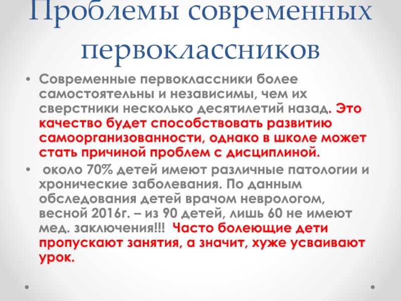 около 70% детей имеют различные патологии и хронические заболевания. По данным обследования детей врачом неврологом, весной 2016г. – из 90 детей, лишь 60 не имеют мед. заключения!!! Часто болеющие дети пропускают занятия, а значит, хуже усваивают урок.