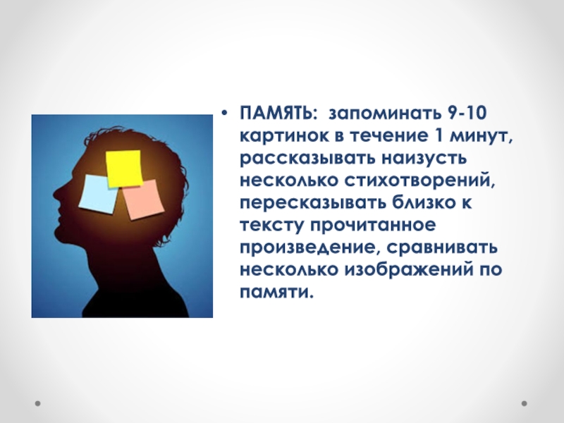 Слайд 4ПАМЯТЬ: запоминать 9-10 картинок в течение 1 минут, рассказывать наизусть несколько