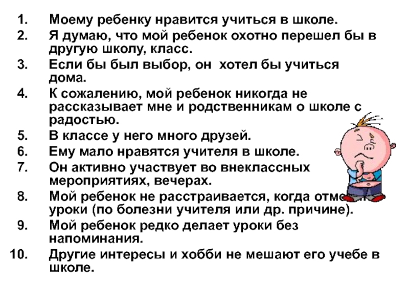 8-10 баллов - У вашего ребенка хорошее отношение к школе и скорее всего у него в ближайшее время не возникнет проблем.