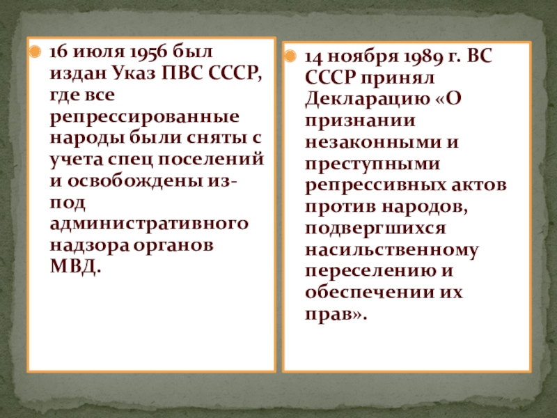 14 ноября 1989 г. ВС СССР принял Декларацию «О признании незаконными и преступными репрессивных актов против народов, подвергшихся насильственному переселению и обеспечении их прав».