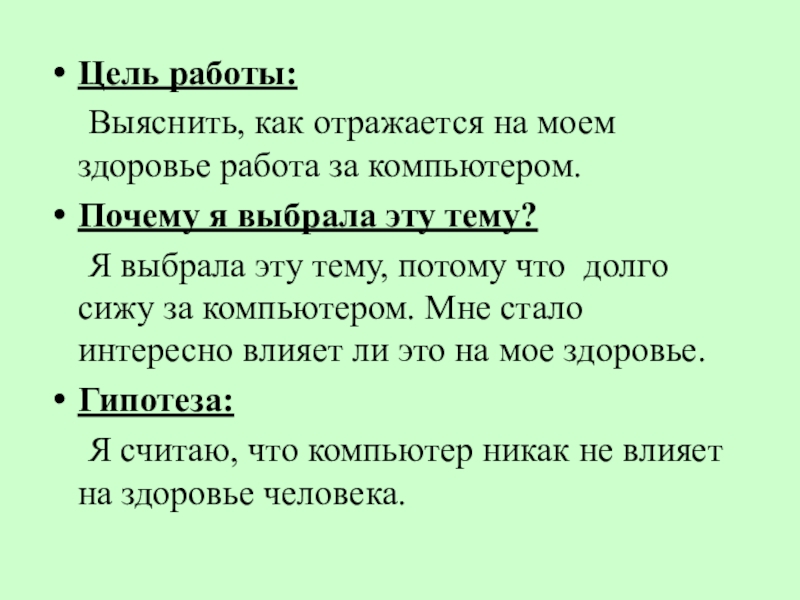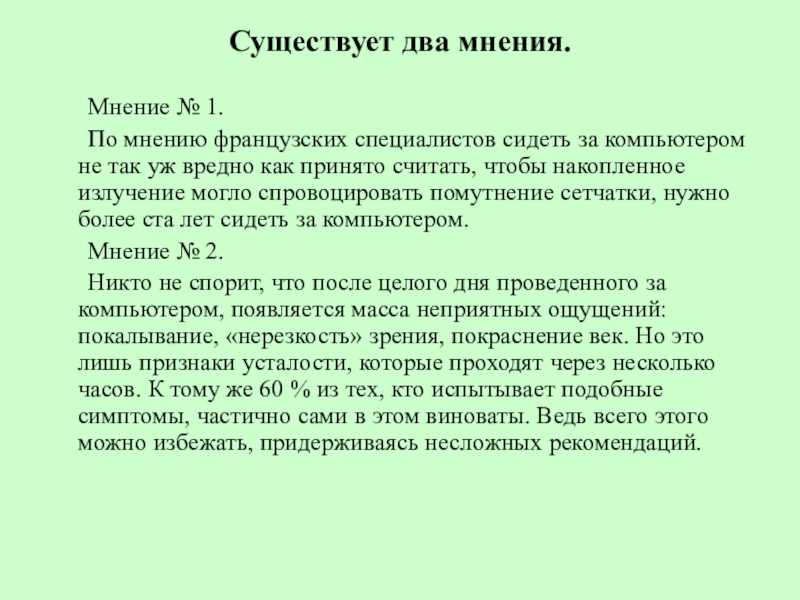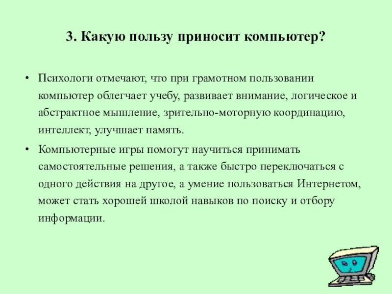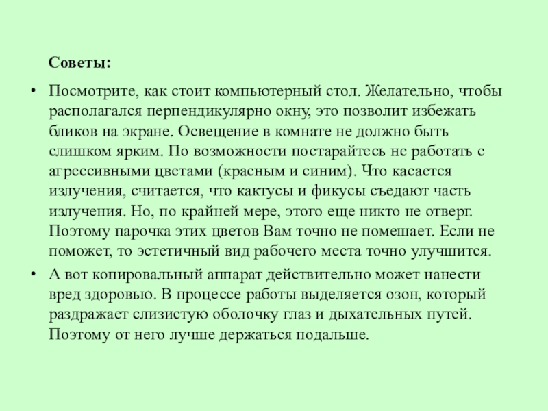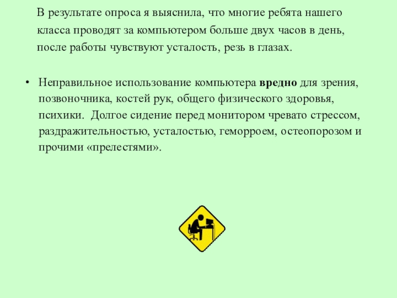 Неправильное использование компьютера вредно для зрения, позвоночника, костей рук, общего физического здоровья, психики. Долгое сидение перед монитором чревато стрессом, раздражительностью, усталостью, геморроем, остеопорозом и прочими «прелестями».