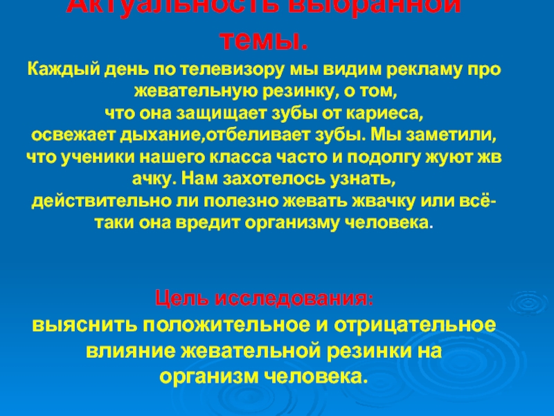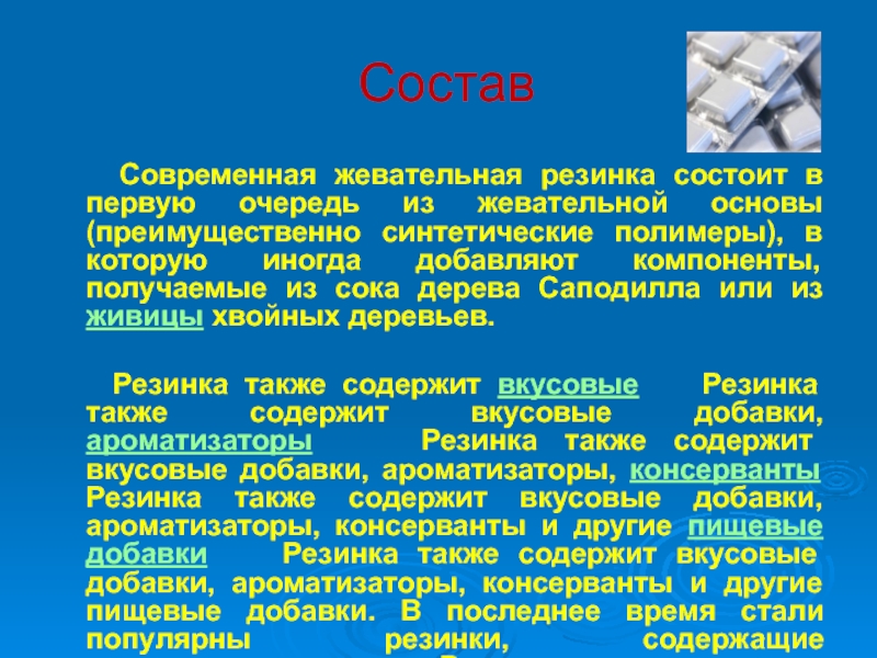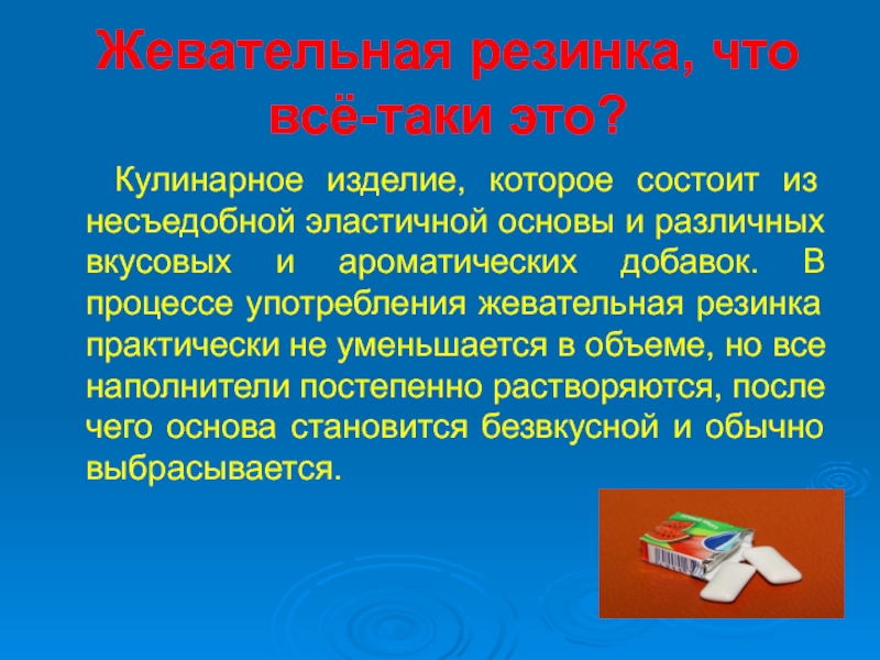 Некоторые растворимые компоненты жевательной резинки неблагоприятны для организма, если поступают в него в большом количестве. Например, сорбит, широко распространенный заменитель сахара в жевательных резинках, оказывает слабительное действие, о чём производители и предупреждают на упаковке.