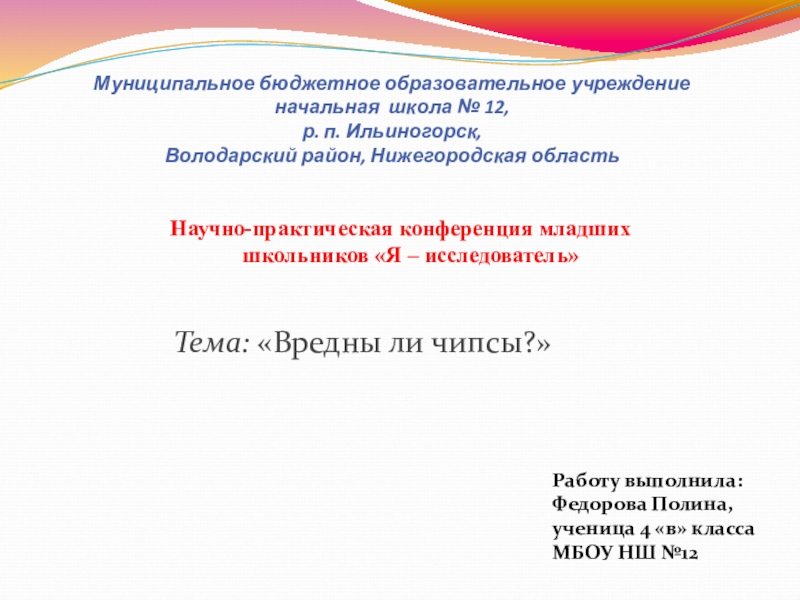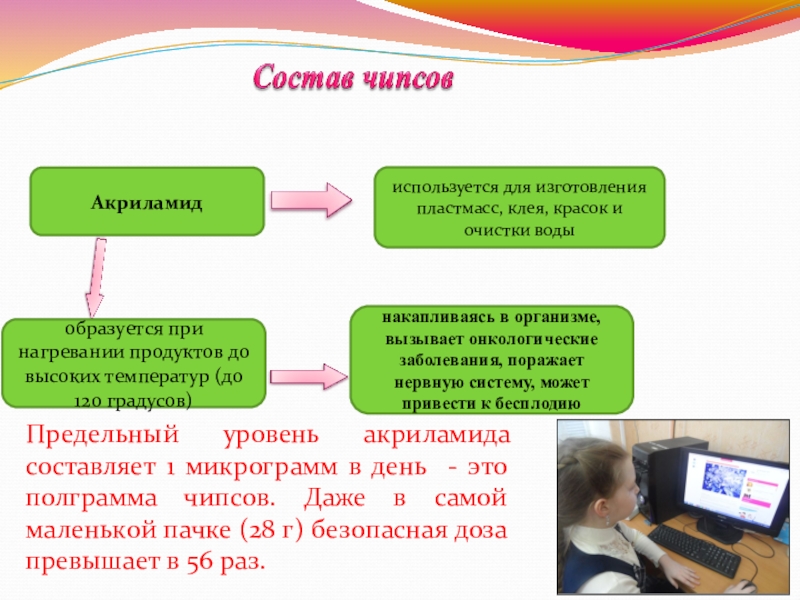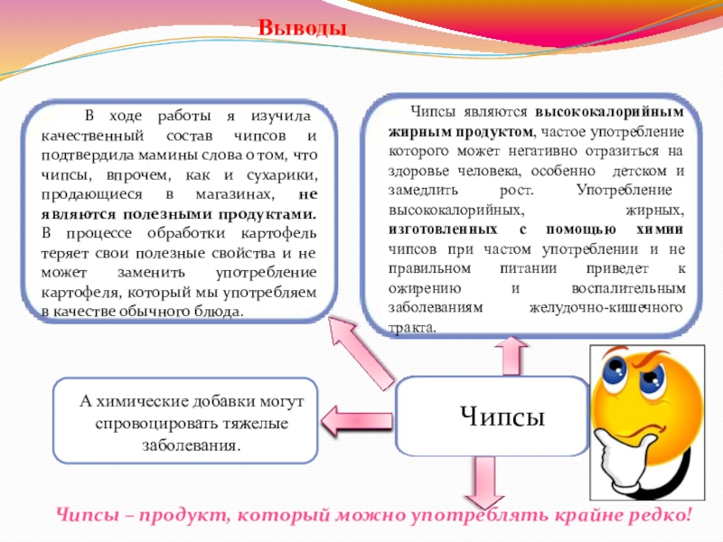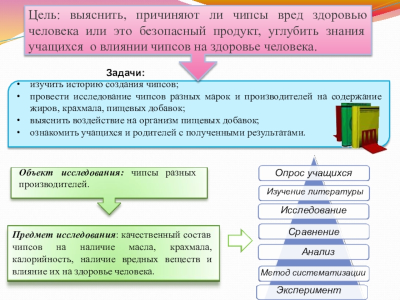 Цель: выяснить, причиняют ли чипсы вред здоровью человека или это безопасный продукт, углубить знания учащихся о влиянии чипсов на здоровье человека.